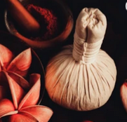 Massage du ventre aux pochons d'herbes chaudes